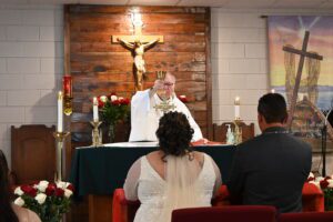 El padre Vic celebra una boda en su nueva misión Santa Juana de Arco en Plymouth, Carolina del Norte.